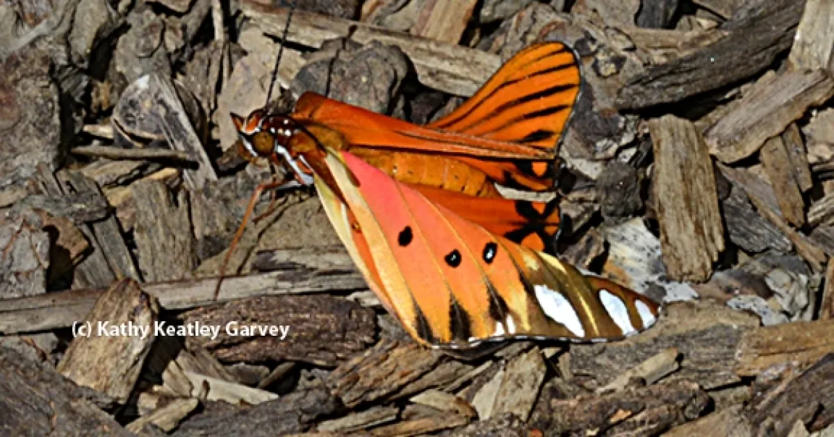 Frankly, it's not every day that a newly emerged Gulf Fritillary butterfly, Agraulis vanillae, lands at your feet. It crawled from its chrysalis, hinged to a eight-foot high tree limb near our passionflower vines (Passiflora), and fell, quite unceremoniously, on a bed of wood chips.