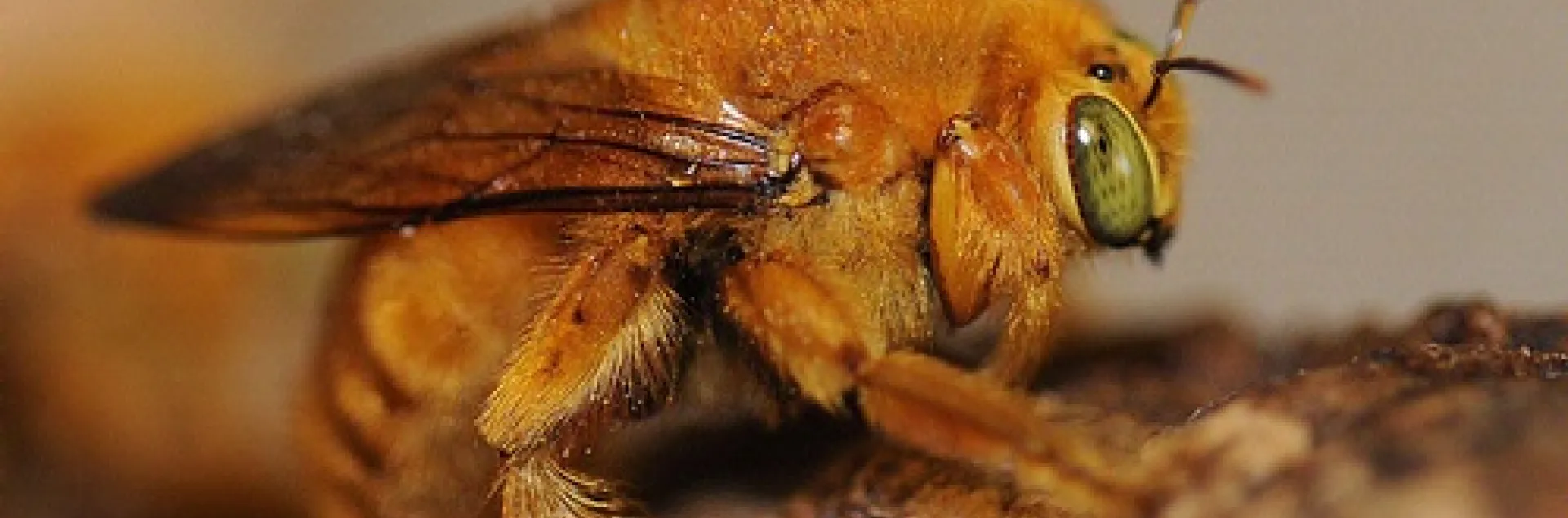 GREEN EYES--The male Valley carpenter bee is a green-eyed, golden insect nicknamed the "teddy bear" carpenter bee. (Photo by Kathy Keatley Garvey)