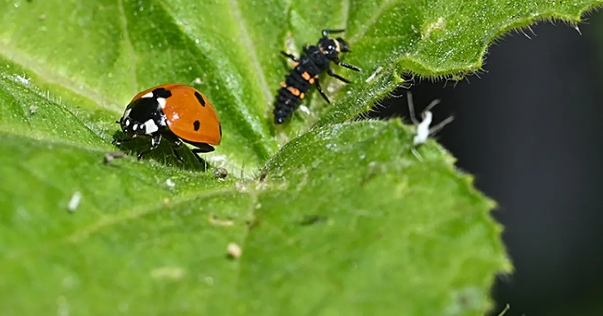 The larvae of lady beetle are mostly black and look like tiny, spiny alligators, but they're beneficial insects just like the adult lady beetles. In the adult and larval stage, they're both predators that prey mainly on aphids, but they'll also eat thrips, spider mites, scale insects, and other soft-bodied insects.