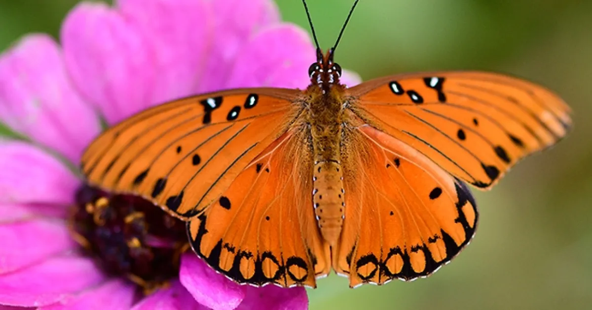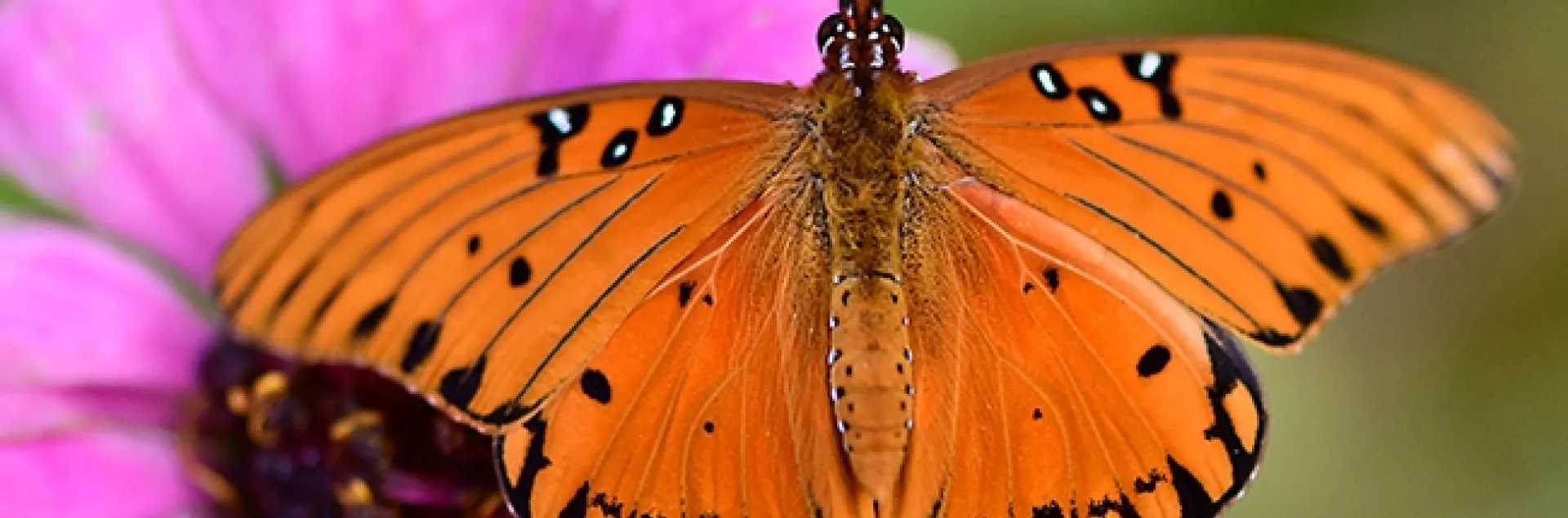 It's Thanksgiving Week and there's a newly eclosed Gulf Fritillary on a tattered pink zinnia "that looks as it has seen better days," as my mother used to say.
