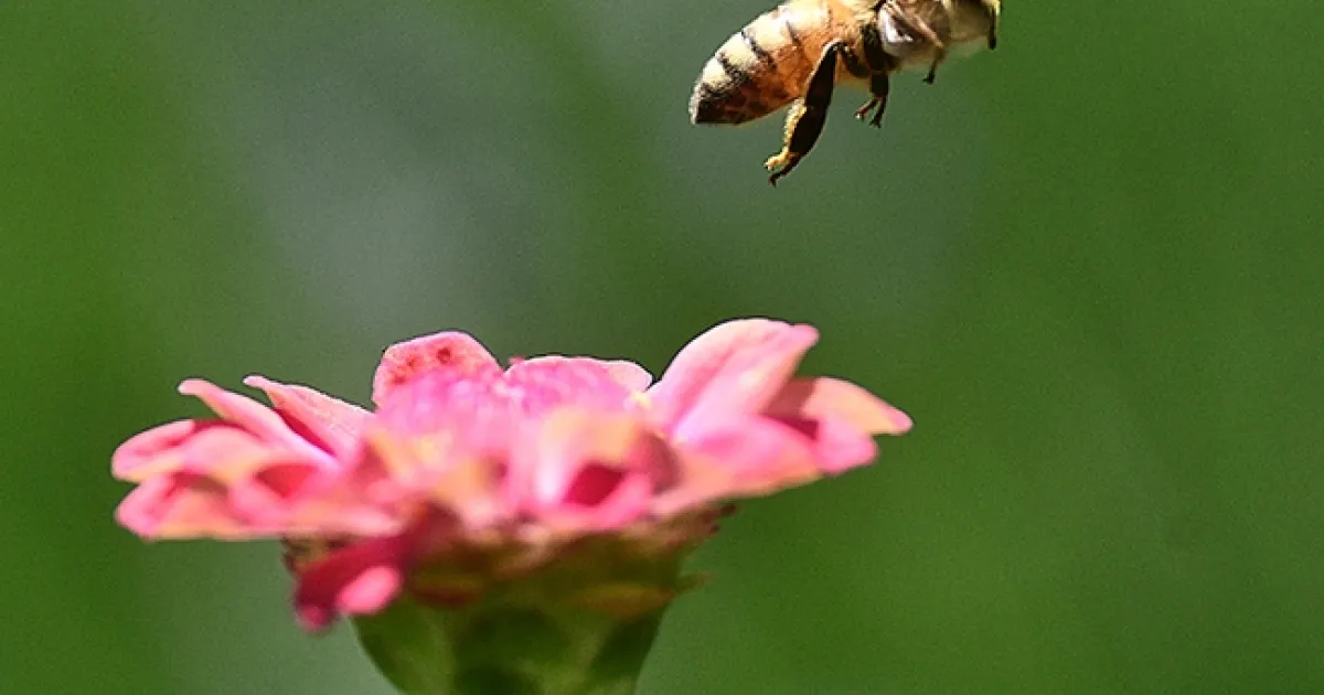 A honey bee, Apis mellifera, leaving a zinnia. (Photo by Kathy Keatley Garvey)