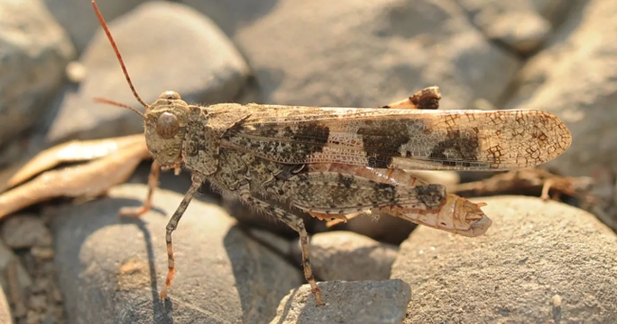 No, not the one below, a banded-winged grasshopper (family Acrididae and subfamily Oedipodinae) that we spotted west of the UC Davis campus--and identified by Steve Heydon, senior museum scientist at the Bohart Museum of Entomology.