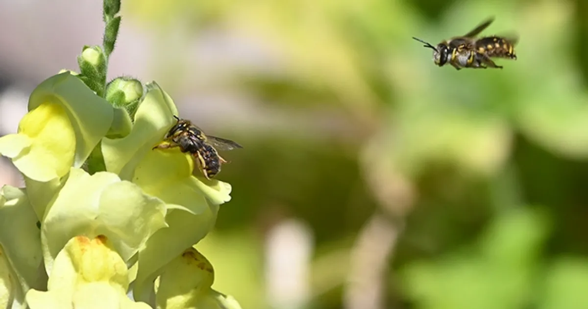 First in series: A male European wool carder bee (Anthidium manicatum) targets a female foraging on a snapdragon. (Photo by Kathy Keatley Garvey)