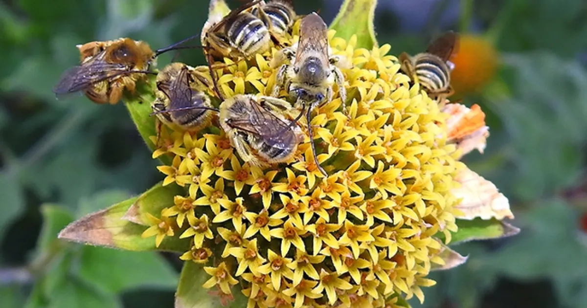 Count yourselves. There are seven of you--seven male Melissodes agilis bees--sleeping on a single spent Mexican sunflower blossom (Tithonia rotundifola).