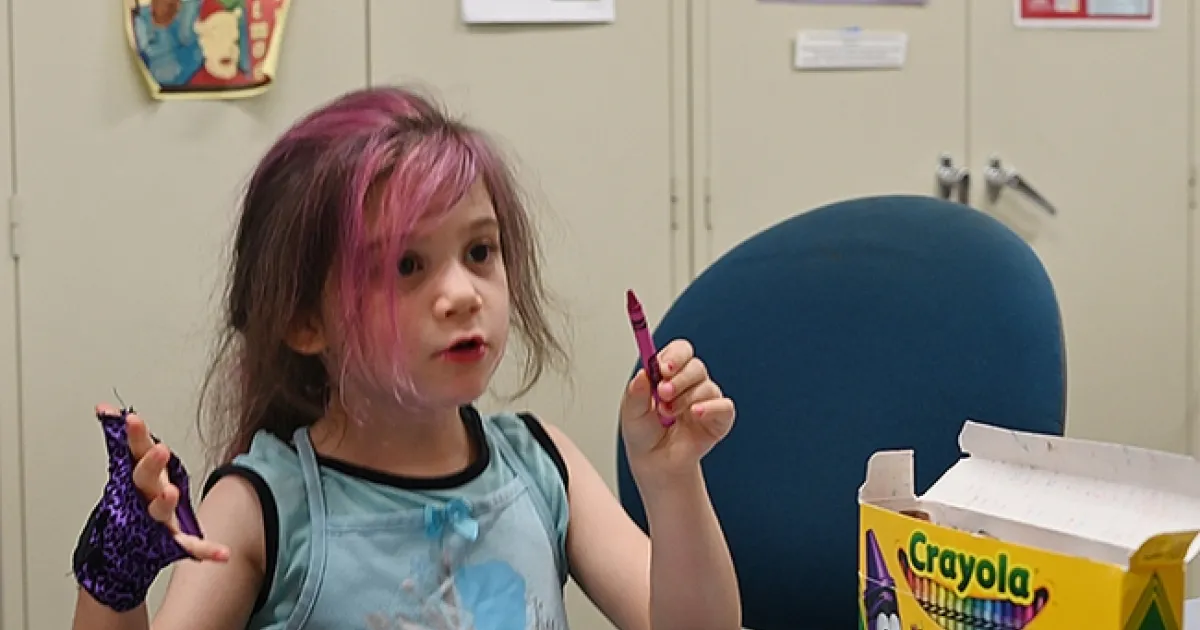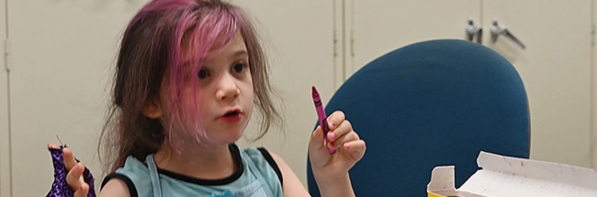 Soraya Qaqunah, 4, of Davis considers what crayons to use to make her "Mantis on a Stick." (Photo by Kathy Keatley Garvey)