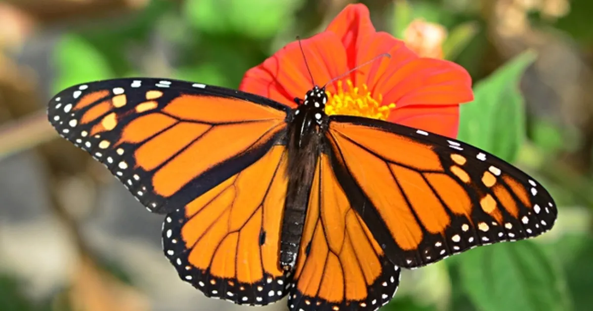 A mighty male Monarch on the move. On its way to one of coastal California's overwintering sites, it stops to sip from flight fuel (nectar) from a Mexican sunflower, Tithonia. (Photo by Kathy Keatley Garvey)