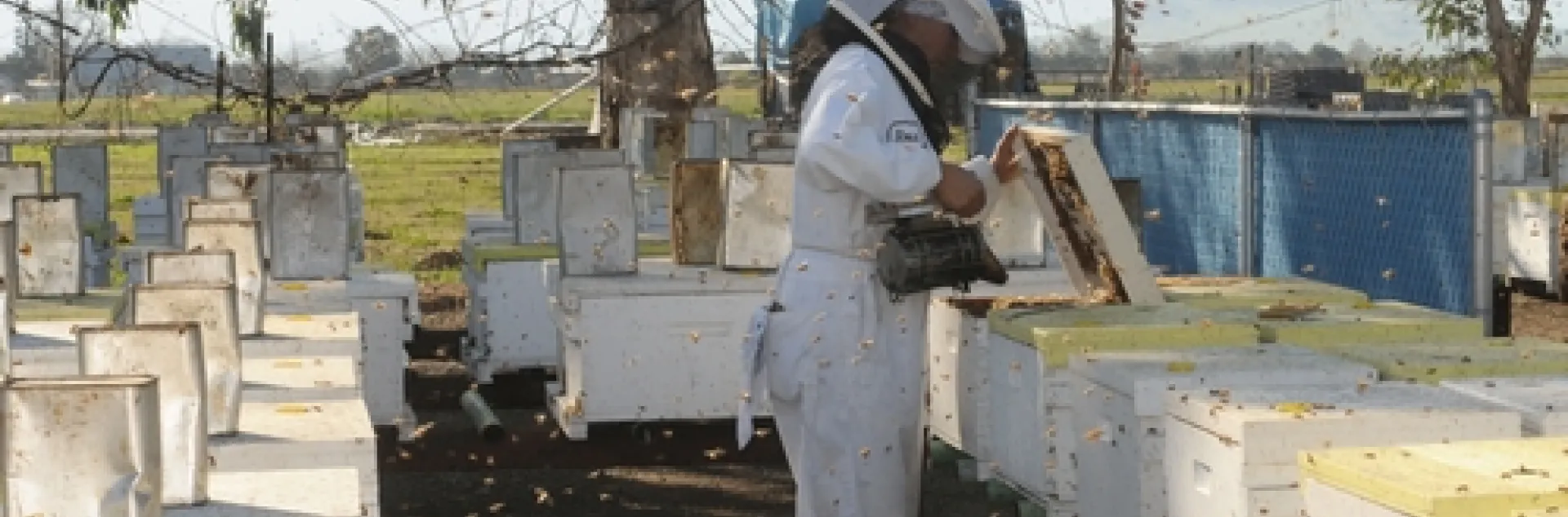 From a distance, you'll see a beekeeper working the hives.