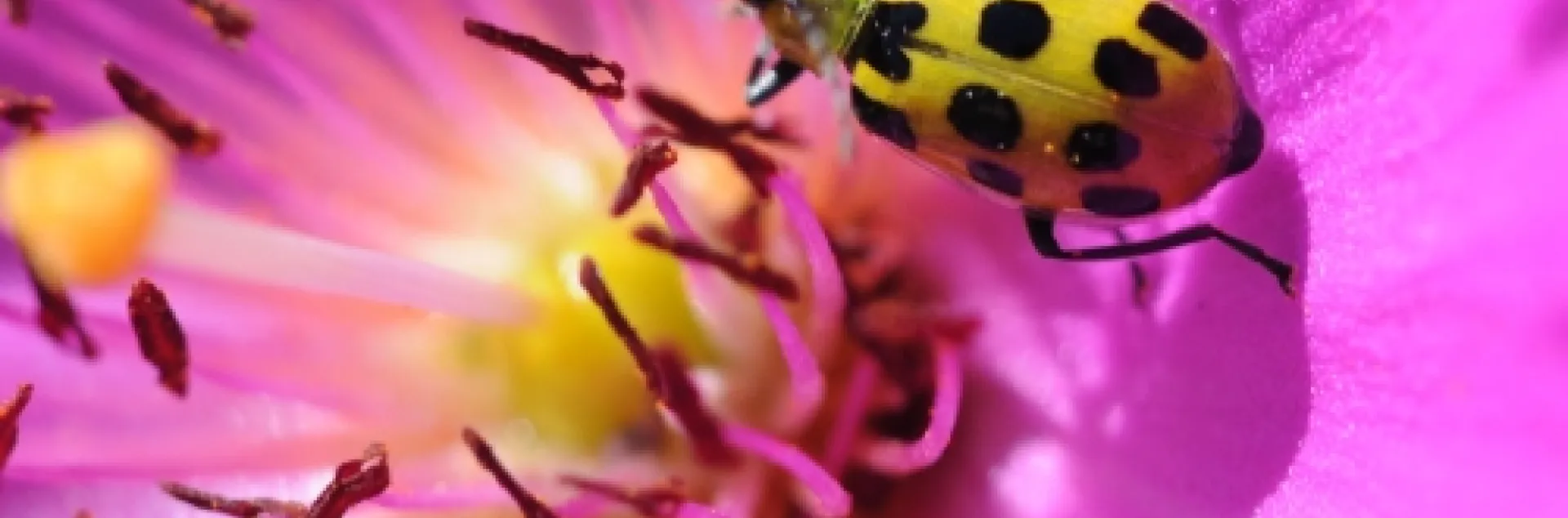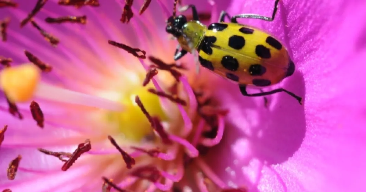 November 17, 2008 Print Last Saturday the rock purslane in our bee friendly garden drew a honey bee, several hover flies and one spotted cucumber beetle.A hover fly landed on a blossom, only to find a spotted cucumber beetle there first. Spotted cucumber beetle The Meeting