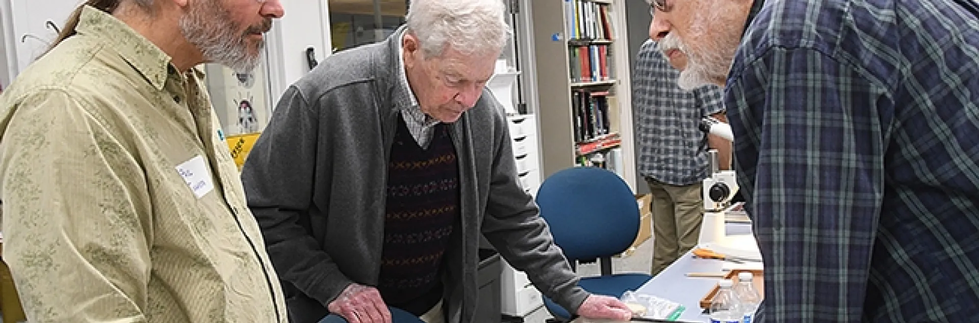 John Lane (left) and Larry Allen discuss specimens. At far right is Bill Patterson. (Photo by Kathy Keatley Garvey)