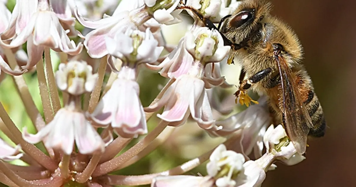 If you've never seen this, this is how it works: milkweed produces pollinia, a sticky structure or packet of pollen grains originating from a single anther (male part). During the flower's complex pollination process, the mass is transferred as a single unit and looks like a yellow wishbone dangling on a honey bee's legs or other parts of her anatomy. It's a devious way for the milkweed to force insects to help them reproduce--in exchange for the sweet nectar reward. (Orchids produce pollinia, too.)