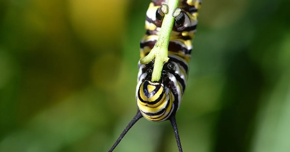 The monarch caterpillar swirls to get the best angle. (Photo by Kathy Keatley Garvey)