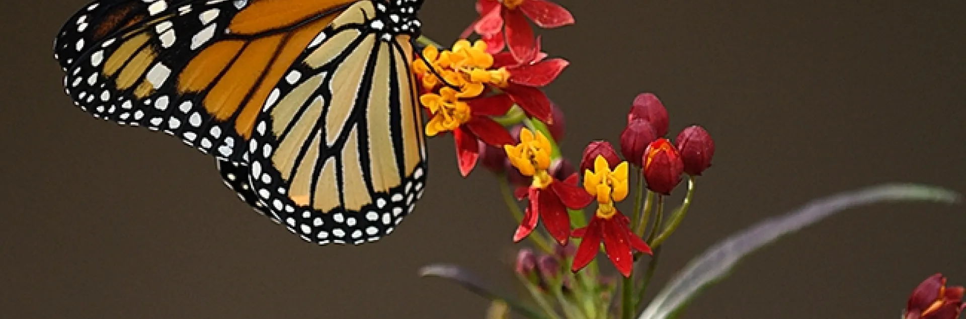 Ms. Monarch, sipping nectar on the tropical milkweed: "This is delicious. You don't mind if I stay 'n sip, sip 'n stay, or awhile?"