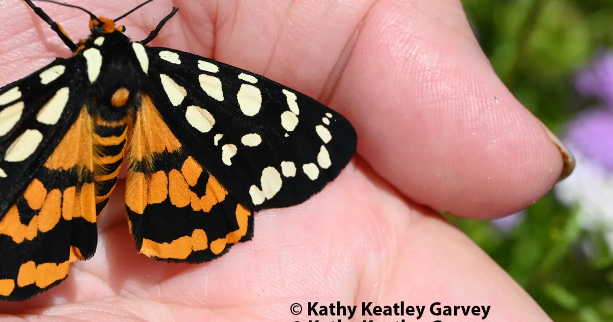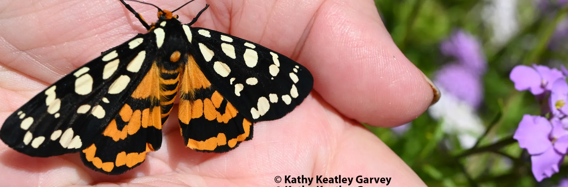 Moths are commonly thought of as drab. Not true. Take the black, orange and white Ranchman's tiger moth, Arctia virginalis. It's spectacular as an adult--and as "the woolly bear caterpillar." We've seen the caterpillar at Bodega Head.