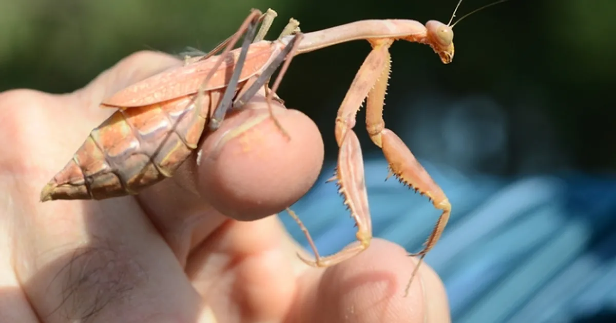 Later this year or next spring, if you're lucky, you'll see an egg case hanging from a twig, leaf or fence. Depending on the species, each case contains about 100 to 200 mantises. When they emerge, they're so hungry that they'll eat one another. Brother and sister. Sister and brother. Cannibalism.