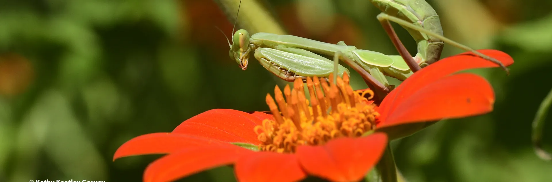 Yesterday we introduced you to Ms. Mantis, a young Stagmomantis limbata perched on a Mexican sunflower, Tithonia rotundiola. She was seeking a “fast food” meal of a bee or a butterfly, but they were much too fast for her.