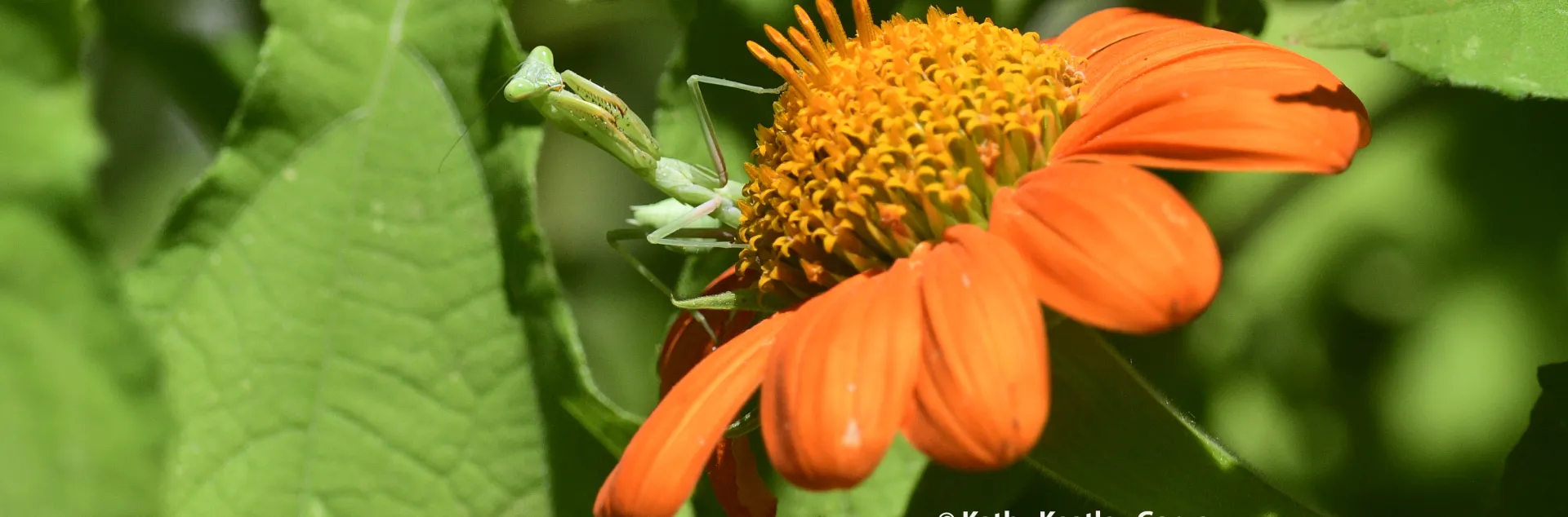 Ms. Mantis stood still, very still, patiently waiting for a "Flower Dash" (opposite of "Door Dash"). But in the sweltering heat, she finally chose shade. She slipped beneath the blossom, remaining unnoticed except for her distinctive shadow.