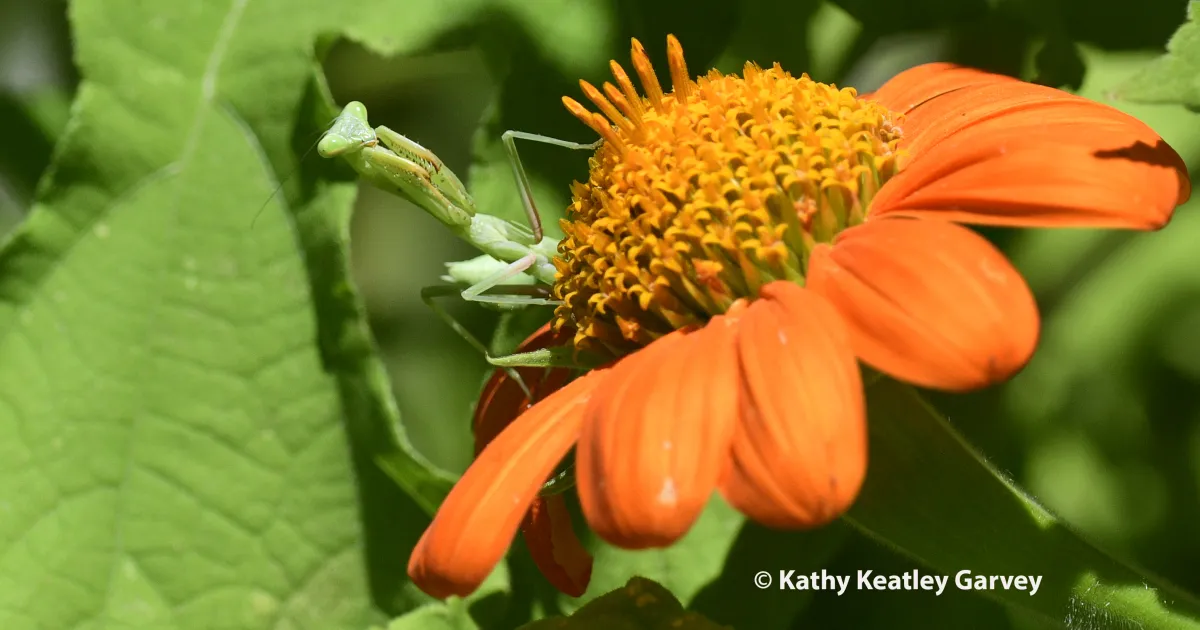 But today, peering over one of the orange blossoms, was something green....a praying mantis, Stagmomantis limbata. She looked hungry. So much fast food! So much! And all so elusive!