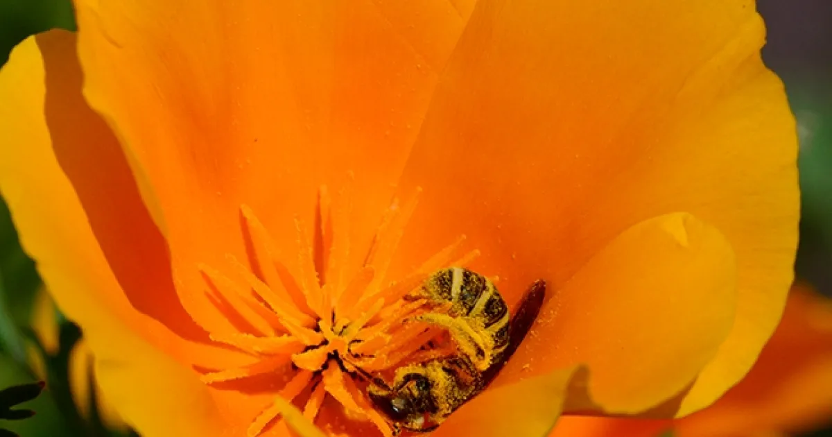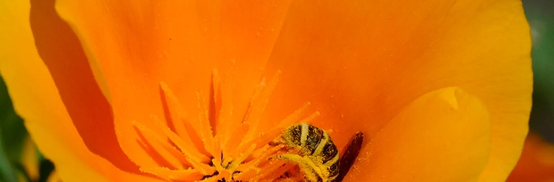 Native bee, commonly known as "halictid bee." Native plant. In fact, the California golden poppy, Eschscholzia californica, is the state flower.