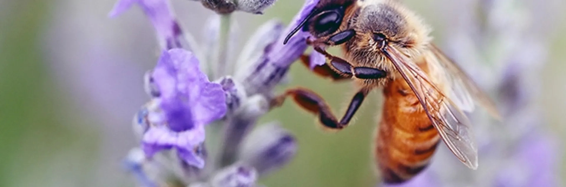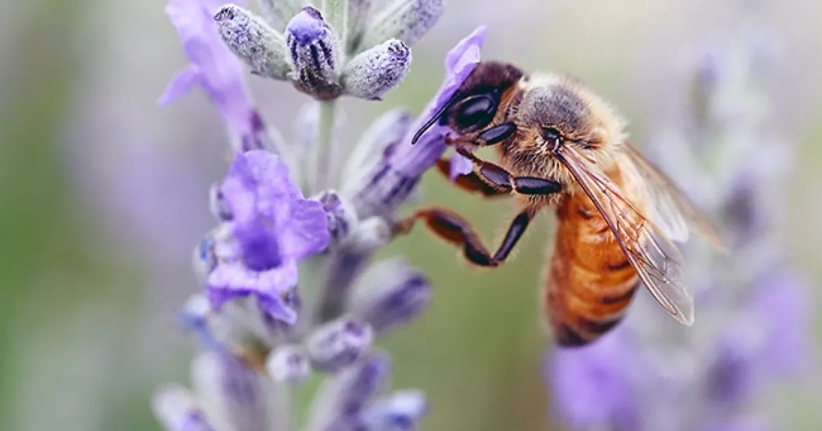 - A honey bee nectaring on lavender in a soft-pastel scenario.