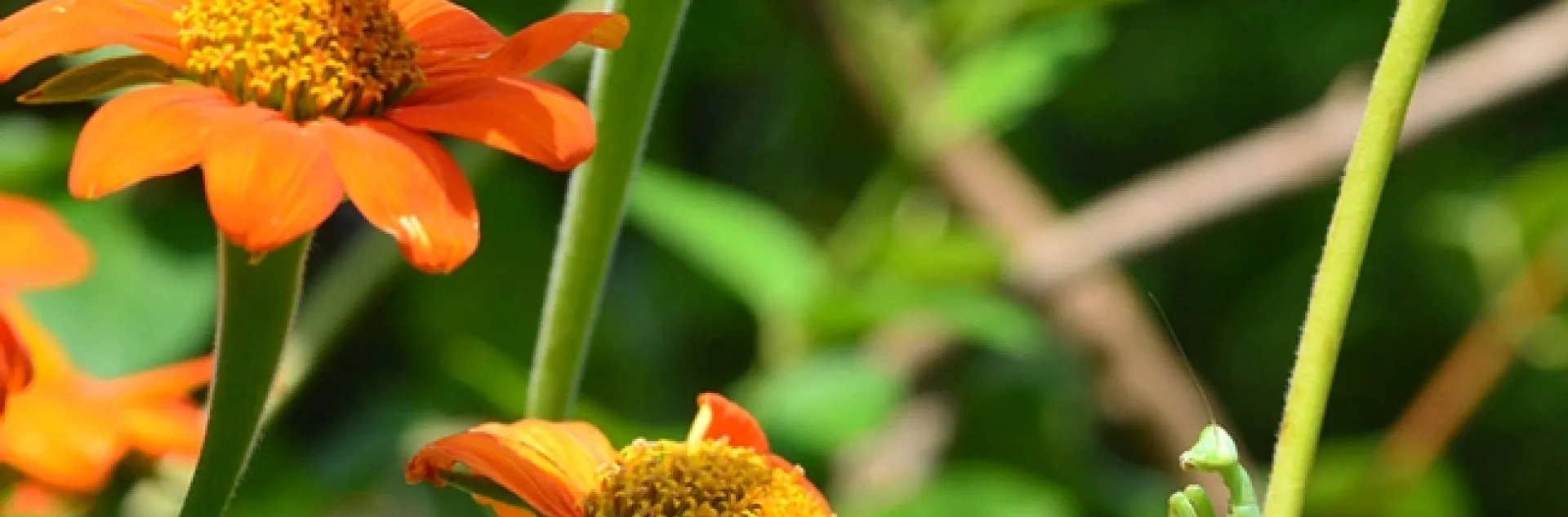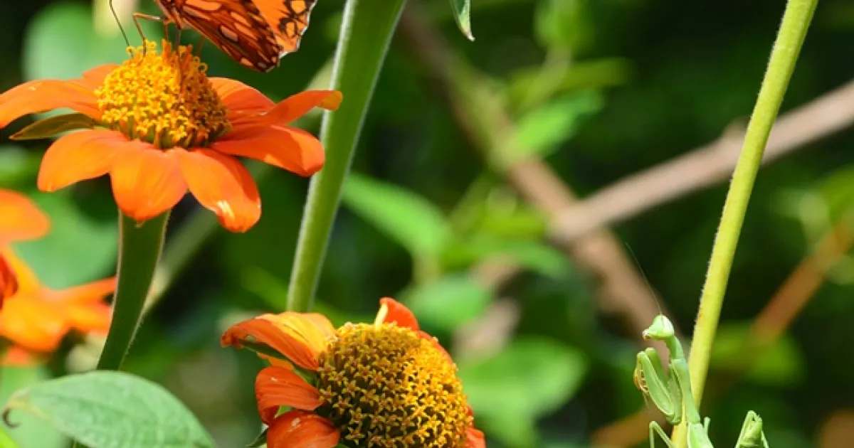 In our family bee garden, they perch on the Mexican sunflower (Tithonia) and lie in wait for prey. You'll see them swiveling their heads at 180 degrees as they patiently wait to ambush an unsuspecting bee or butterfly. Their spiked forelegs ensure there's no escape.