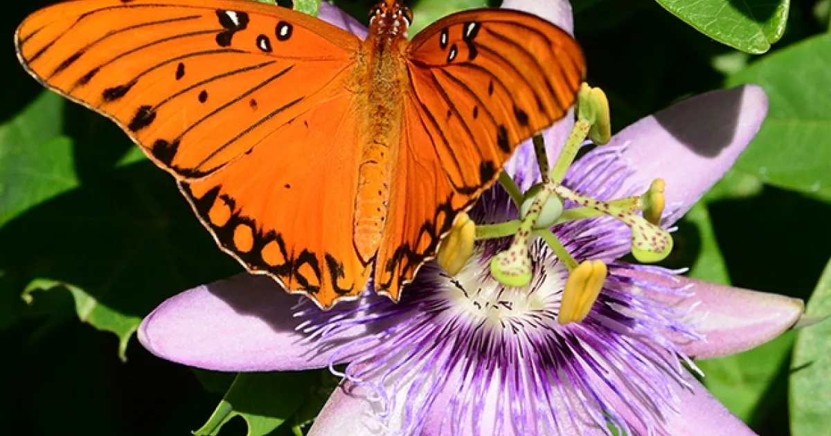 The brilliant orange butterfly with the silver-spangled wings is one spectacular butterfly. Together the passion butterfly and the passionflower live up to their names.