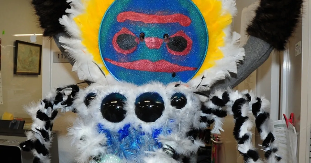 The best costume at  the Bohart Musuem's recent Halloween party was of a peacock jumping spider,   designed, created and worn by UC Davis entomology undergraduate student Wade Spencer.