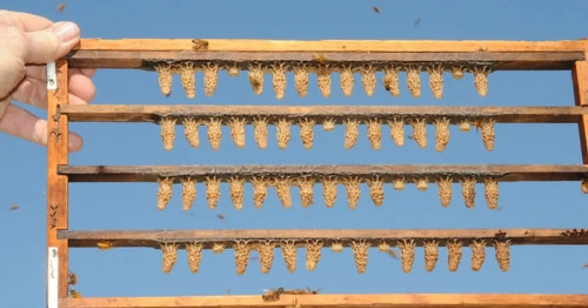 A beekeeper held a frame up to the sky as worker bees cleaned out the vacated queen bee cells.