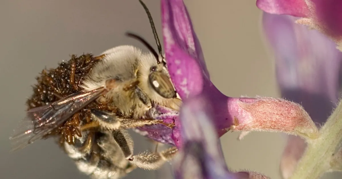Digger bee, Habropoda pallida, a solitary ground-nesting bee, on Borrego milkvetch. (Photo by Leslie Saul-Gershenz, used with permission)