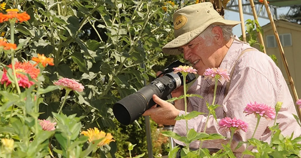 Photographer Allan Jones of Davis focuses his camera on insects in the Häagen-Dazs Honey Bee Haven. (Photo by Kathy Keatley Garvey)