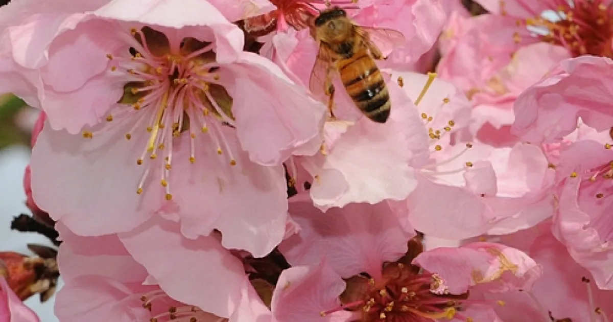 Two things haven't changed much in four centuries: the beauty of the delicate pink blossoms and the beauty of the industrious bees.