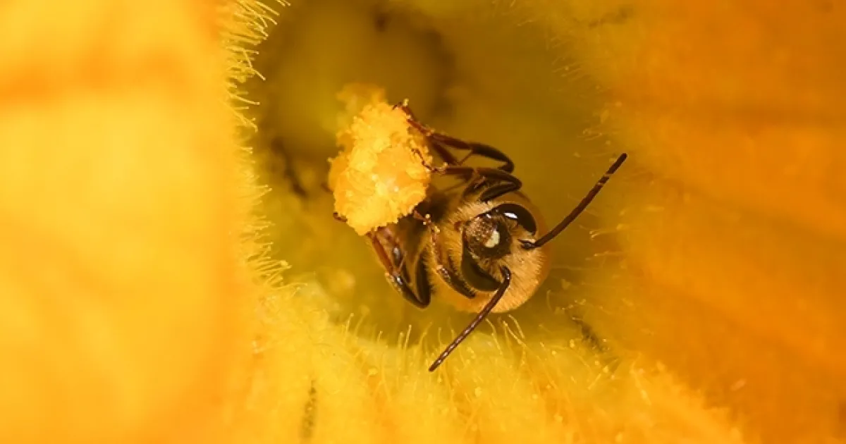 A squash bee, Peponapis pruinosa, pollinating a squash. (Photo by Kathy Keatley Garvey)