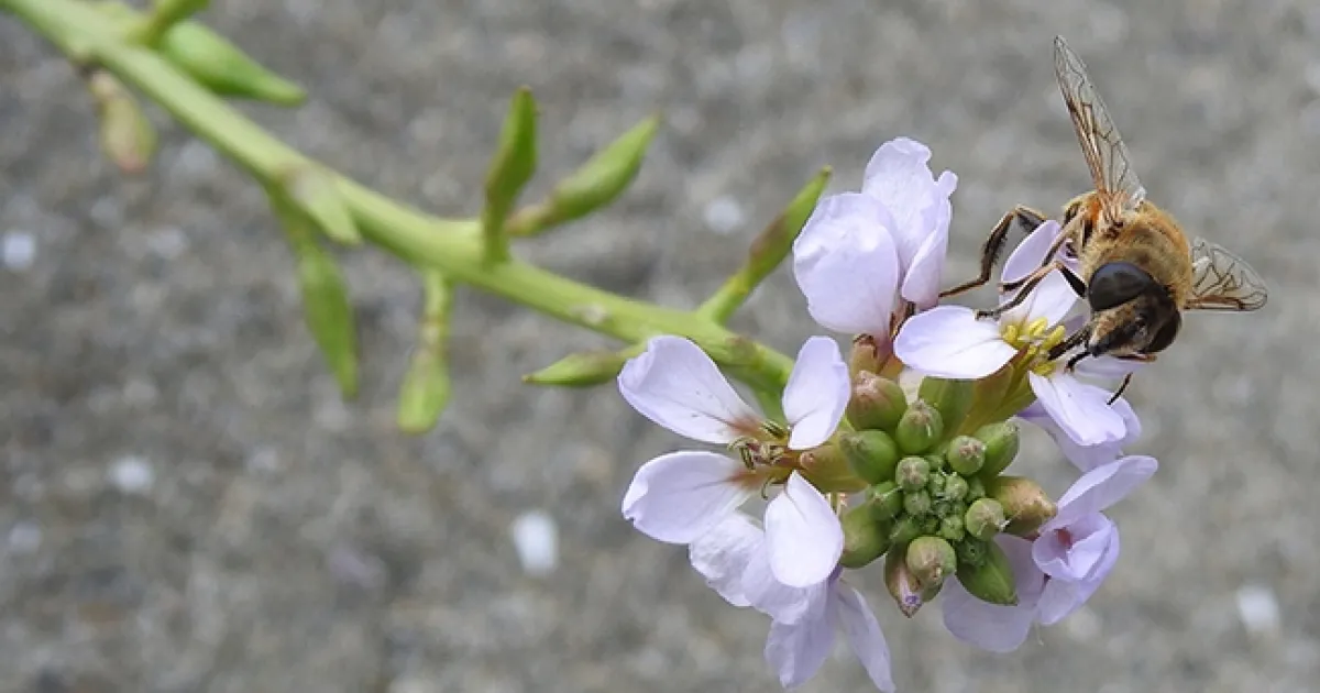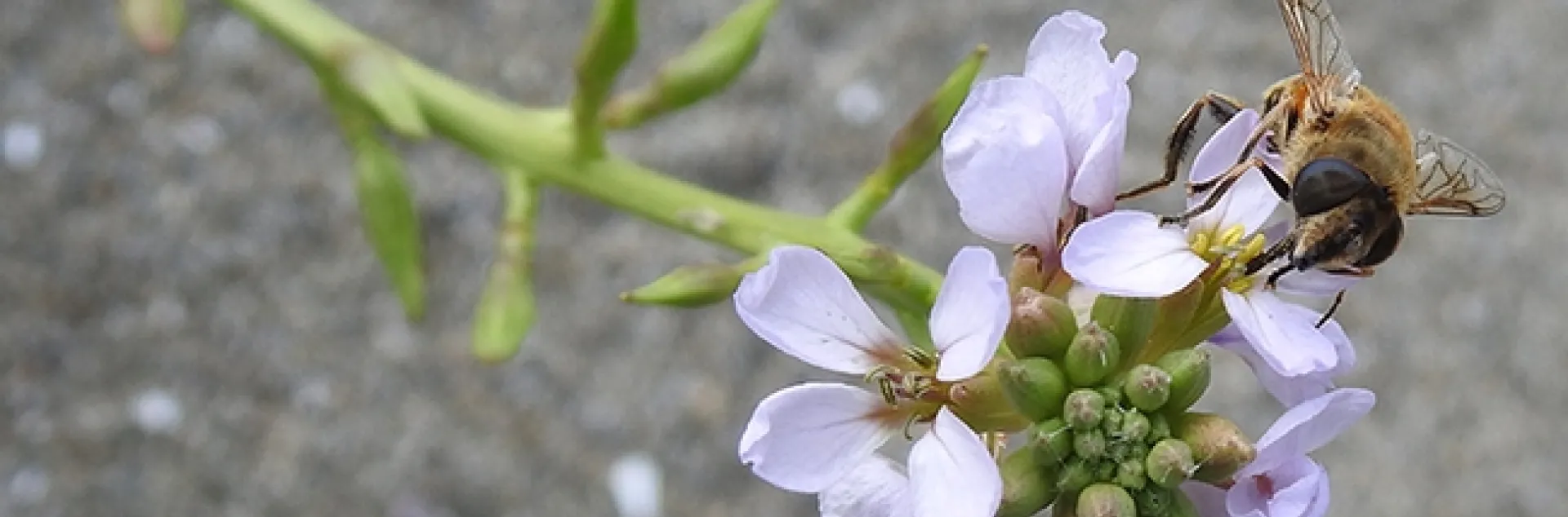 And then: what a delight to see. Apis mellifera (honey bees) and Eristalis tenax, syrphid flies (better known as a "drone flies") nectaring on the tiny blossoms of a sea rocket plant (genus Cakile).