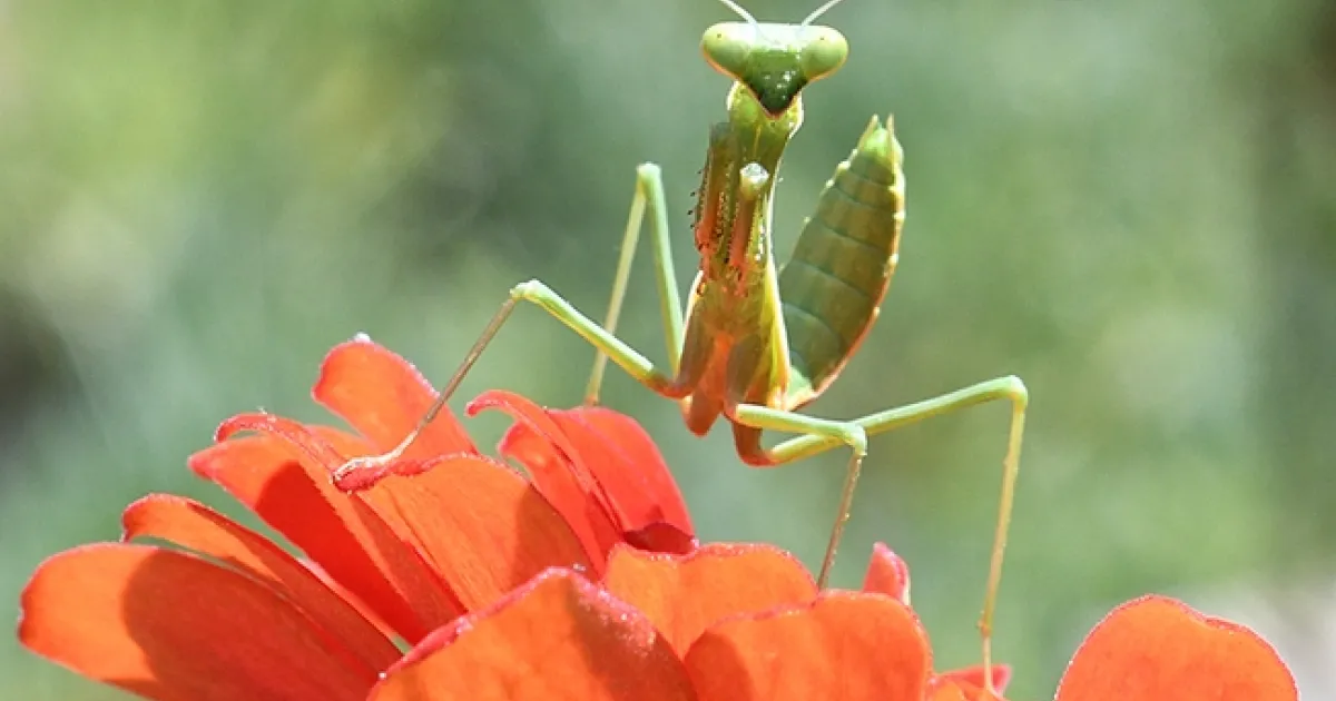 The scenario: a male praying mantis, Stagmomantis limbata, is perched on a pink zinnia in a Vacaville pollinator garden filled with bees and butterflies.