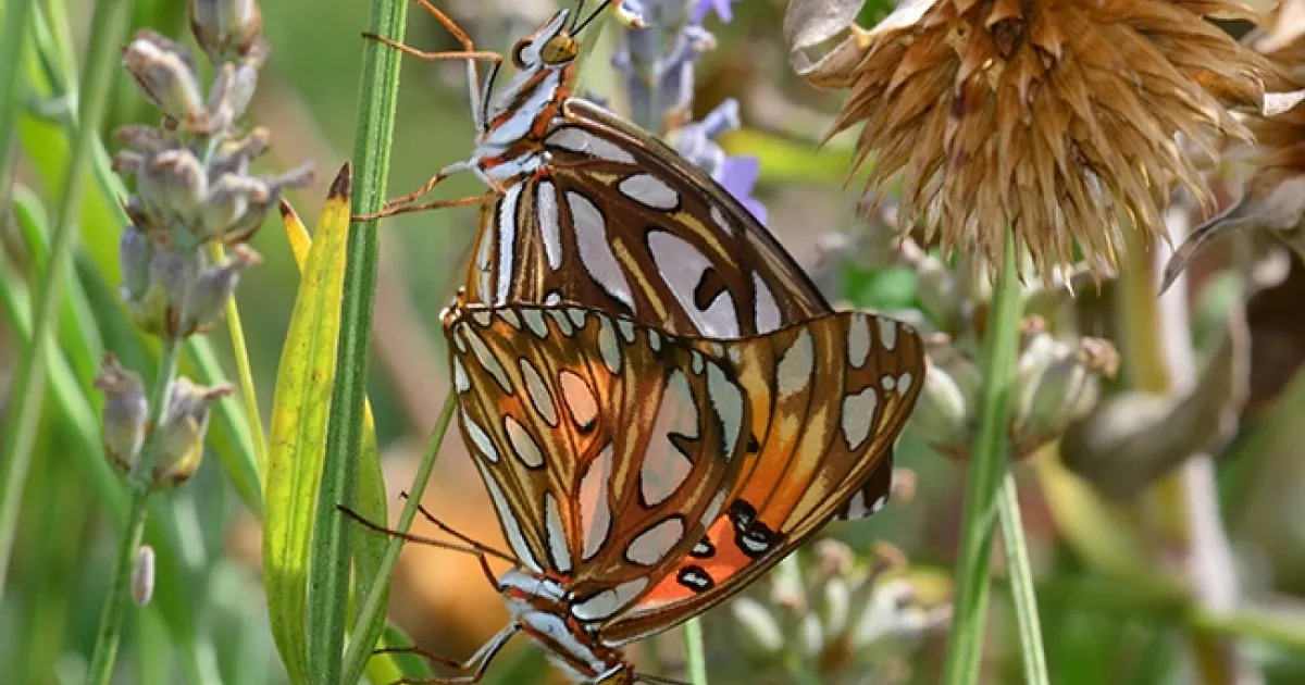 You're walking by a patch of lavender and Mexican sunflower (Tithonia) and you notice that two Gulf Fritillaries (Agraulis vanillae) are doing what birds 'n' bees 'n butterflies do.