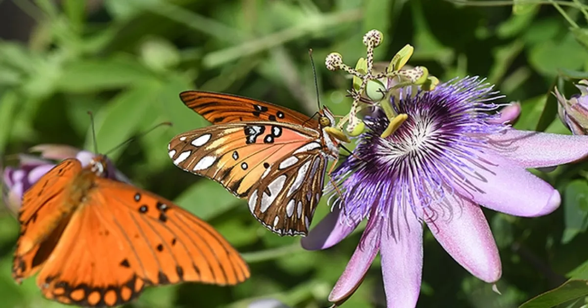 Near them, Gulf Frit caterpillars hungrily munch the leaves. Soon they will form a chrysalis. From egg to larvae to chrysalis to adult.