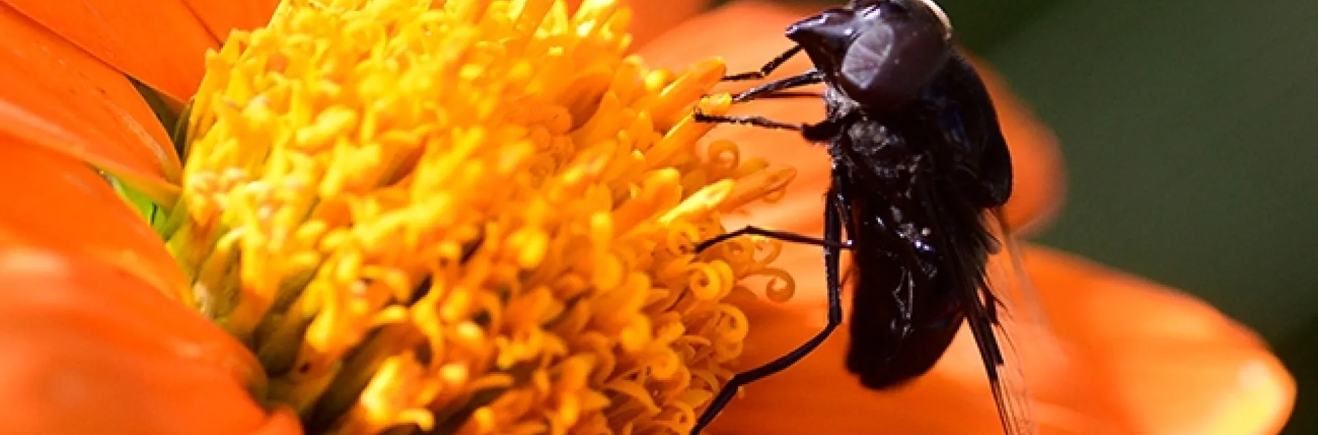 A Mexican cactus fly, Copestylum mexicanum, nectaring on a Mexican sunflower, Tithonia rotundifola in a Vacaville garden. (Photo by Kathy Keatley Garvey)