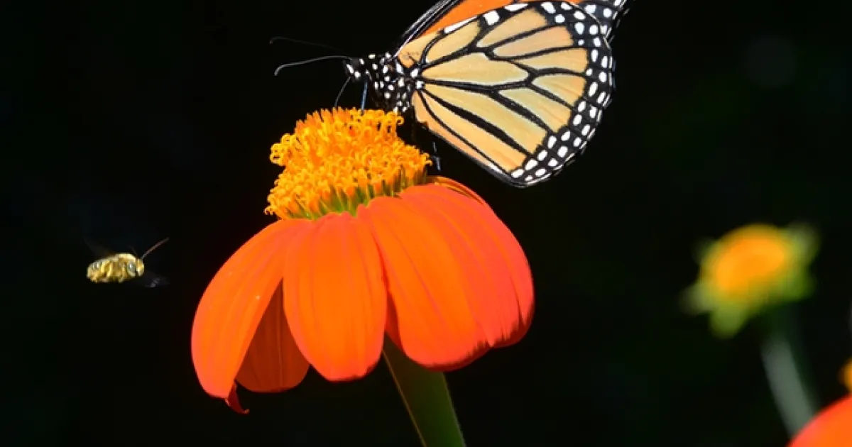 A longhorned bee, Melissodes agilis, targets a monarch nectaring on a Mexican sunflower (Tithonia) in Vacaville, Calif.(Photo by Kathy Keatley Garvey)
