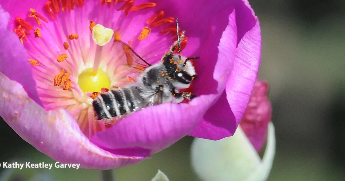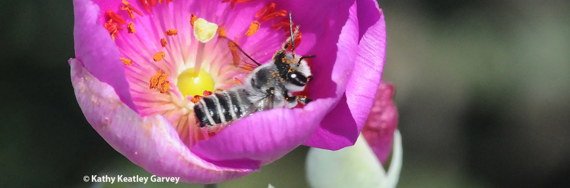 Cover Image: A male leafcutter bee rests in a rockpurslane in a Vacaville garden. (Photo by Kathy Keatley Garvey)
