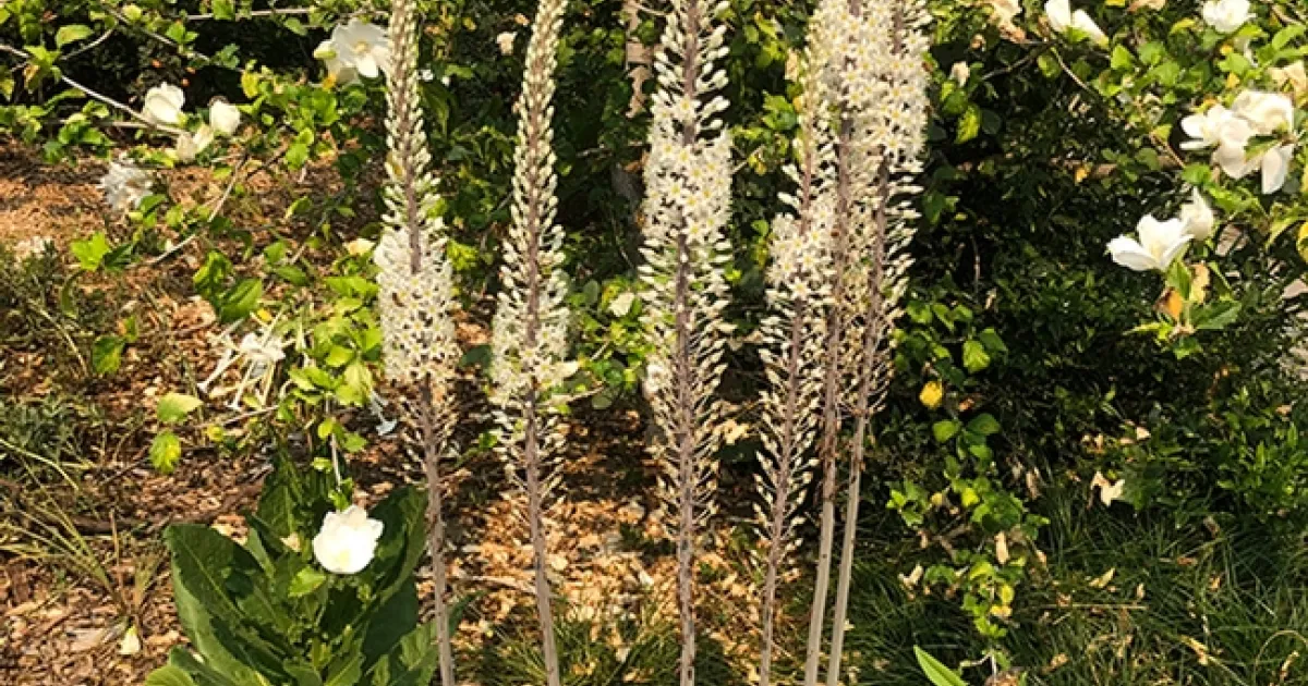 The sea squill, thriving in the Carolee Shields White Flower Garden and Gazebo, is a bee magnet, not to mention it's an incredible flowering plant in an incredible place.