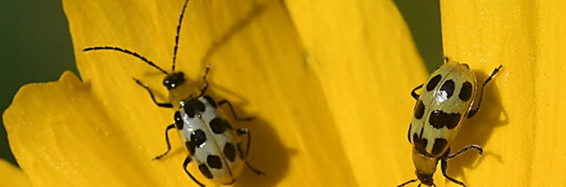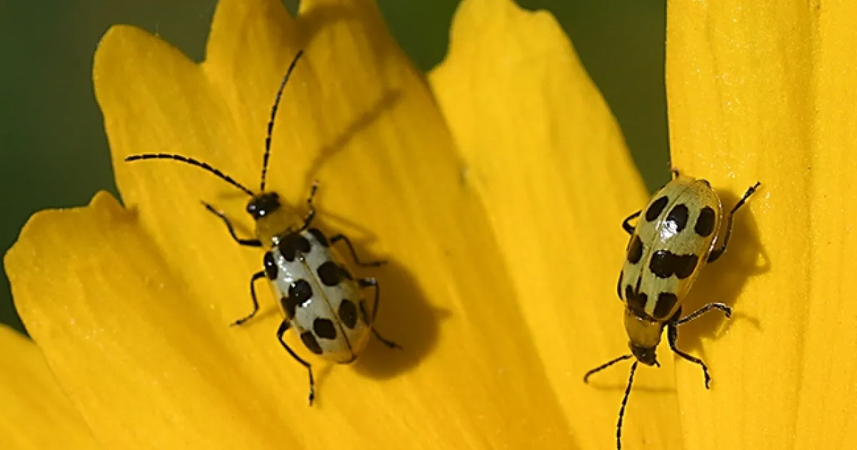 "Cucumber beetles are very common pests in vegetable gardens and may also attack ripening stone fruit," says the UC Statewide Integrated Pest Management Program. "The most abundant species in California is the western spotted cucumber beetle, Diabrotica undecimpunctata...The western spotted cucumber beetle is greenish yellow and has twelve black spots on its back."