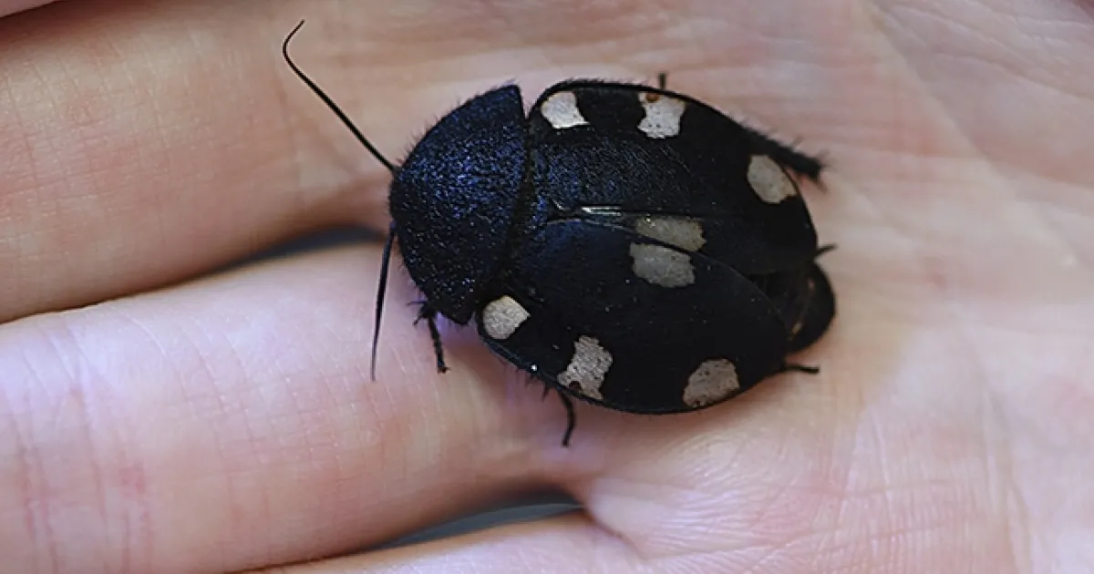 That would be the aggressive ground beetle Anthia sexguttata known for its strong defenses, including the ability to spray chemical irritants.