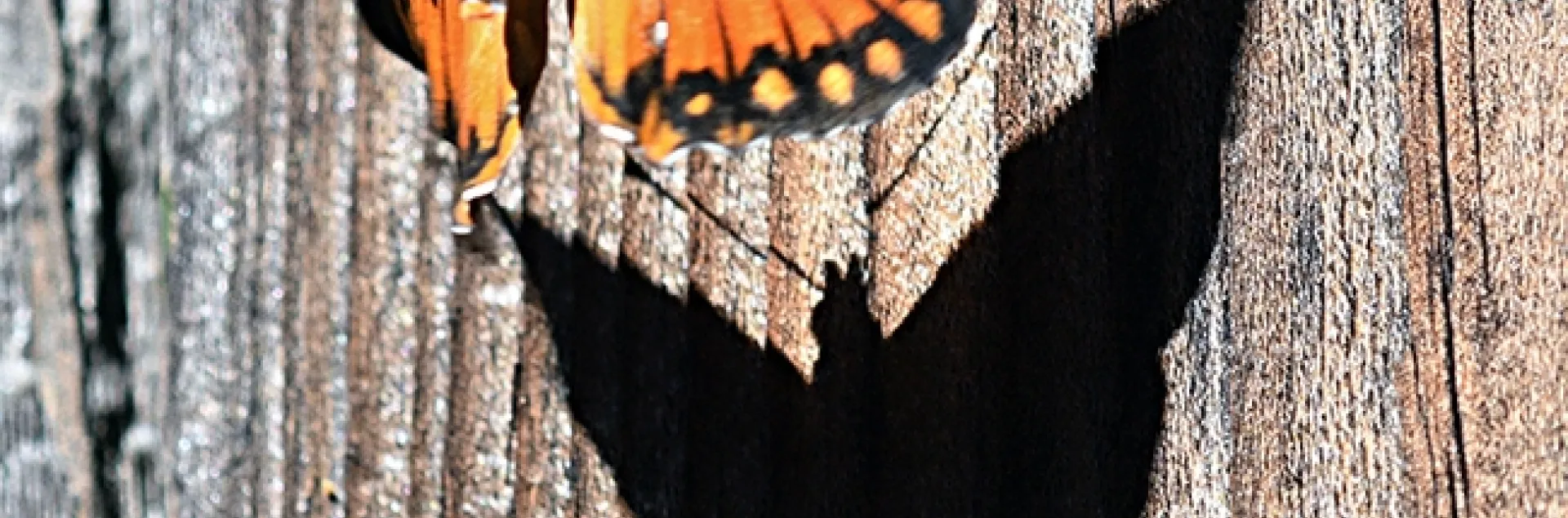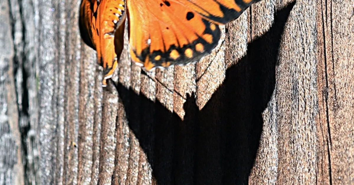 It follows the Gulf Fritillary--a brightly colored orange and black butterfly with silver-spangled wings--up a fence in Vacaville, Calif., and vanishes.