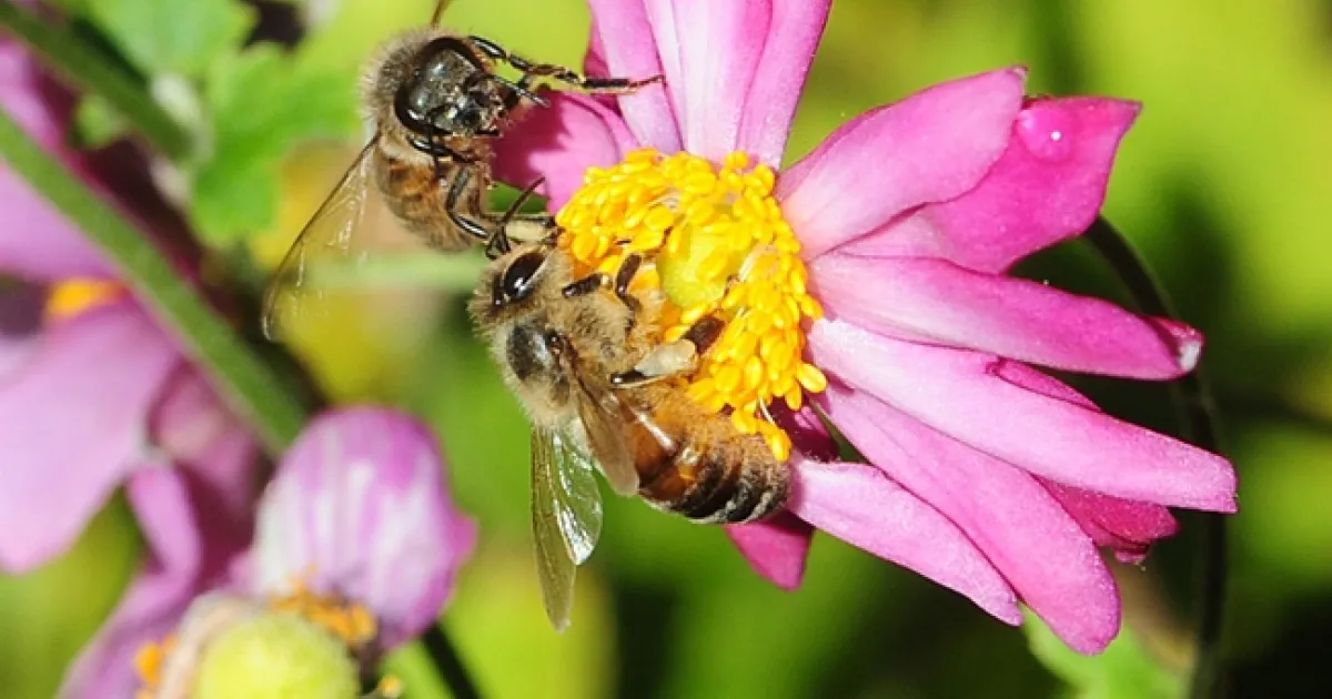Two honey bees compete for floral resources as they forage on a Japanese anemone in the Luther Burbank gardens, Santa Rosa. (Photo by Kathy Keatley Garvey)