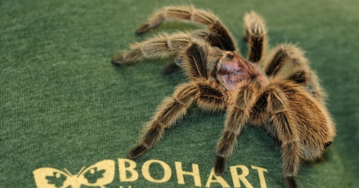 Peaches is now part of the educational exhibit at the Bohart, where personnel will explain why a tarantula is not an insect, but a part of the spider family. It has two main parts, the prosoma (or cephalothorax) and the opisthosoma (or abdomen). A waist-like pedicle connects the two.  They have small spinelike urticating hairs on their abdomen that they may release when threatened.