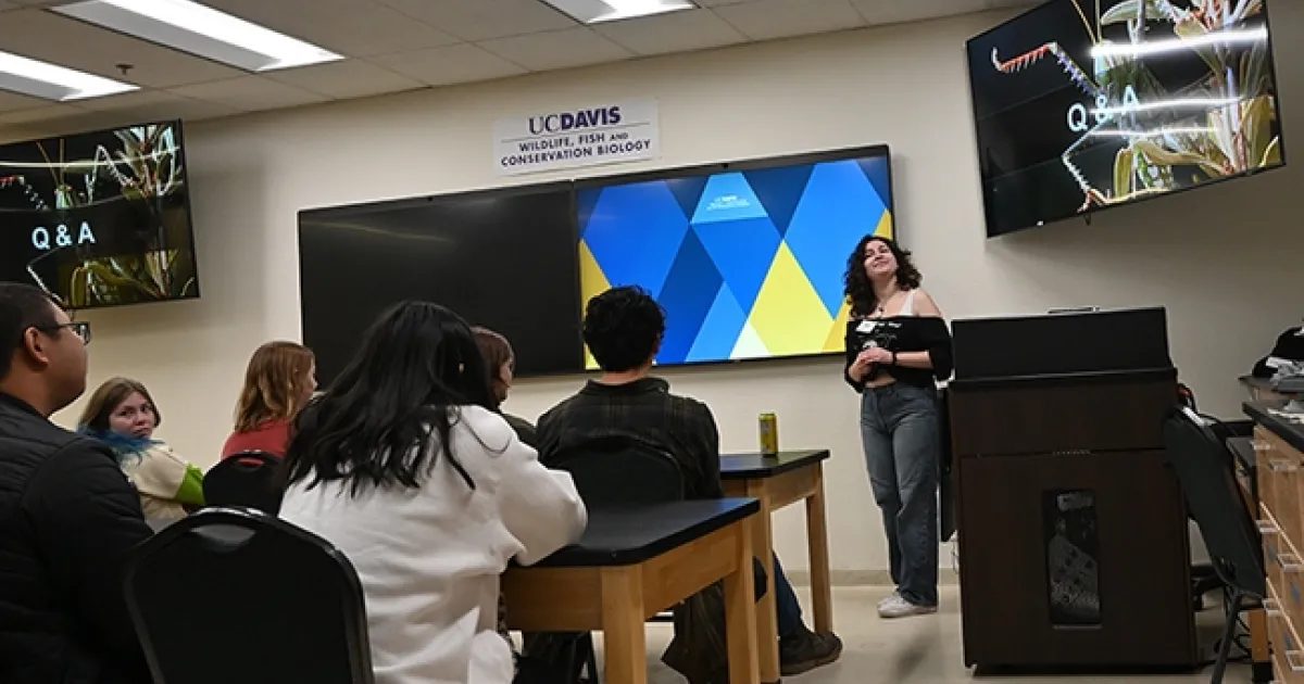 UC Davis third-year entomology student Sol Wantz, an intern at the Bohart Museum of Entomology, president of the UC Davis Entomology Club, and an undergraduate researcher in the Neal Williams' lab, shed light on "Grasshoppers, Crickets and Katydids" when she delivered a presentation at a recent Bohart Museum open house.