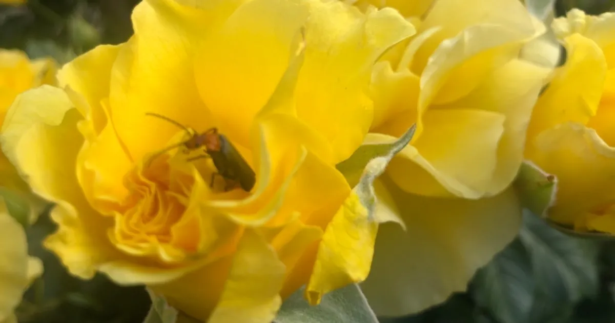 A soldier beetle on a yellow rose. (Cell phone photo by Kathy Keatley Garvey)