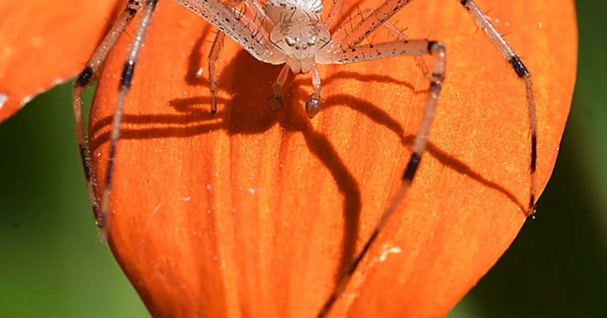 "Is this my best side?" The male crab spider strikes a "pose" for the camera. (Photo by Kathy Keatley Garvey)