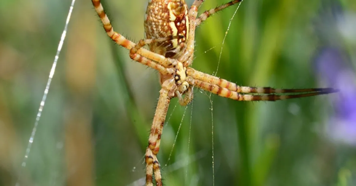 As for the banded garden spider, BugGuide.net offers this identification: "Pale yellow, carapace has silver hairs, abdomen is striped in silver, yellow, and black...Its legs are spotted."