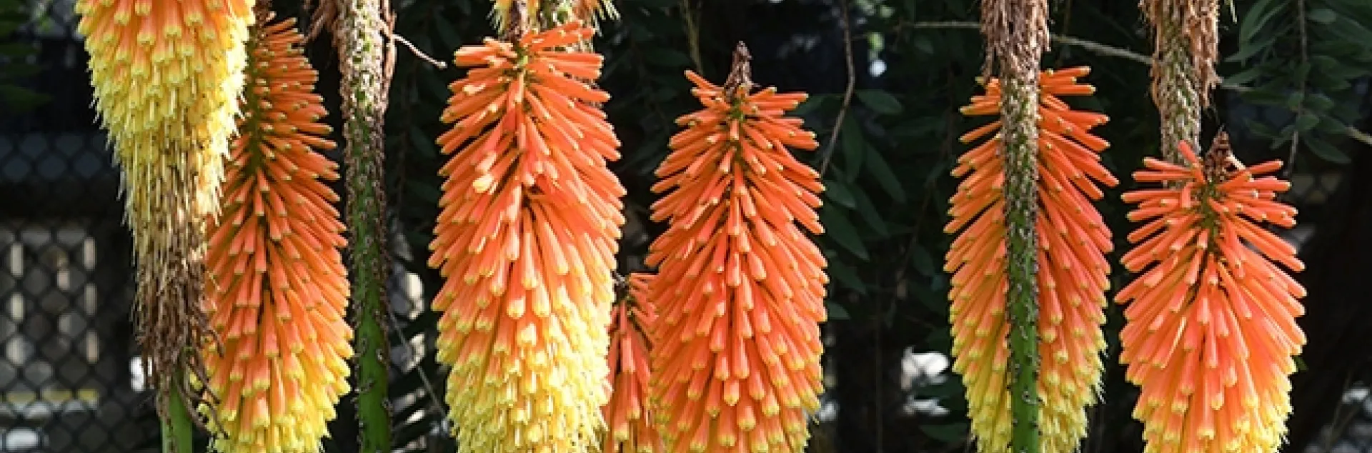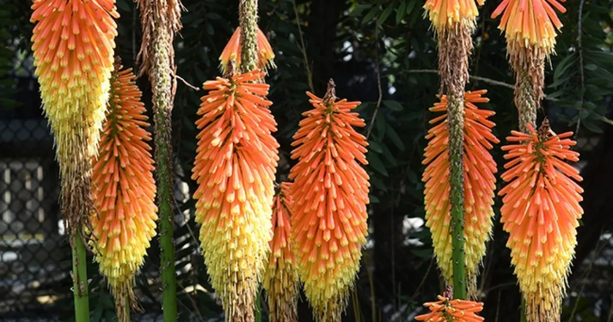 Its stems,  stretching 5 to 6 feet tall, are topped with brilliant spikes of reddish-orange tubular flowers. They are Santa Claus-red, honey yellow, and pumpkin orange, all wrapped in one.