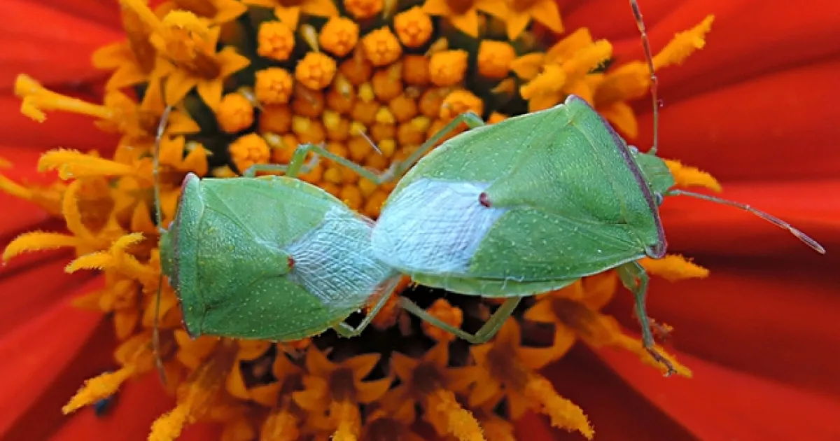We recently spotted two red-shouldered stink bugs in our family bee garden doing what Ella Fitzgerald called "falling in love."